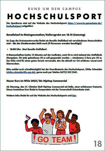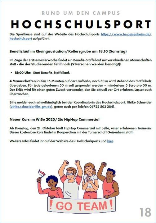 Am Samstag, den 18.10.2025 findet eine Sportveranstaltung im Rahmen der Erstiewoche statt, die vom Hochschulsport zusammen mit der Turnerschaft Geisenheim (TSG) organisiert wird.