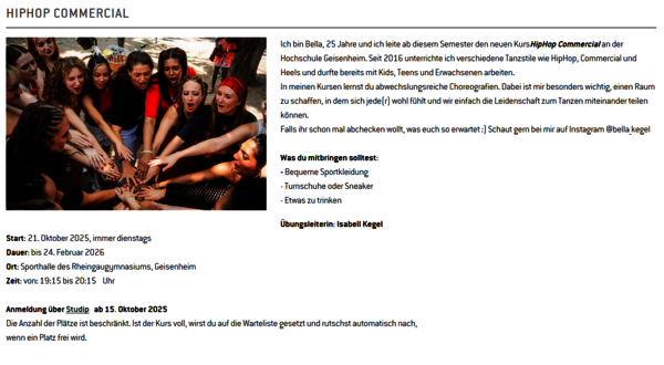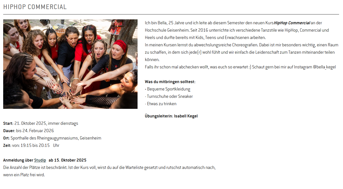 Ab dem 21.10.2025 bietet die Turnerschaft Geisenheim in Kooperation mit der Hochschule Geisenheim den neuen Kurs HipHop Commercial an.